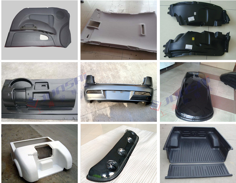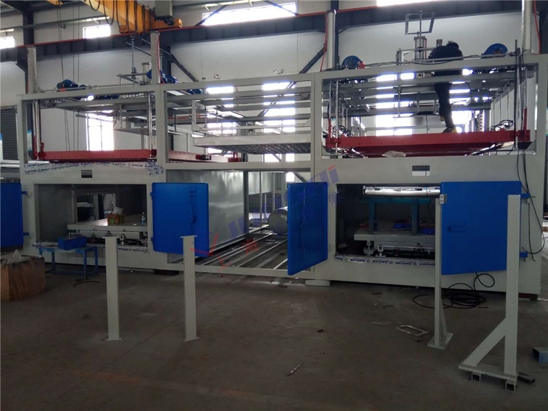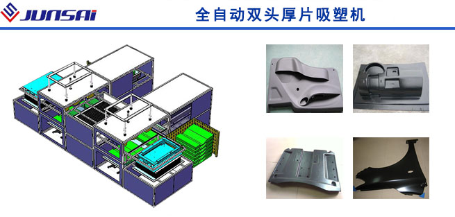 全自动双头厚片吸塑机是由上海骏精赛自主研发的大型双工位厚板真空吸塑设备,主要用于汽车内饰等大型板材厚吸塑件加工成型。这台机器有两个吸塑工位、两个上料工位、一个加热炉、两种加热模式:自动上料和手动上料。